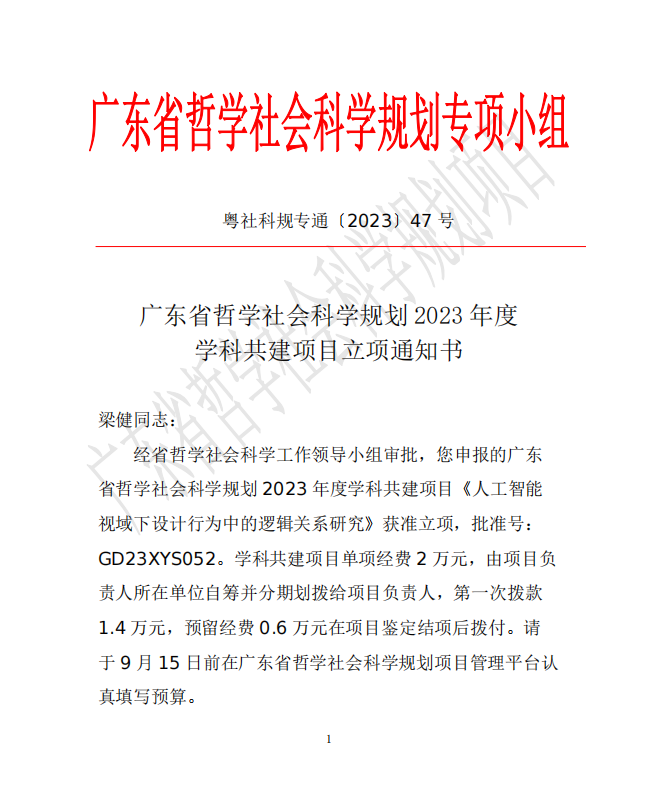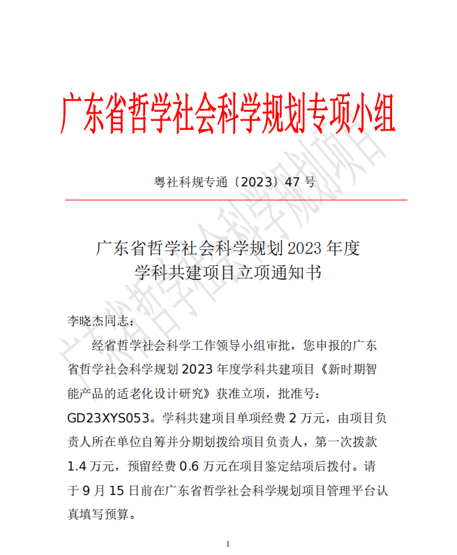 经广东省哲学社会科学工作领导小组批准(广东省社科规划办,http://www.gdpplgopss.org.cn/tzgg/content/post_1127279.html ),广东省哲学社会科学规划2023年度学科共建项目立项名单于2023年9月5日发布,全省共立项811项,其中由William威廉官网梁健老师和李晓杰老师分别申报主持的两项艺术类项目位列其中(全校共获得3项),主题分别是《人工智能视域下设计行为中的逻辑关系研究》和《新时期智能产品的适老化设计研究》。
