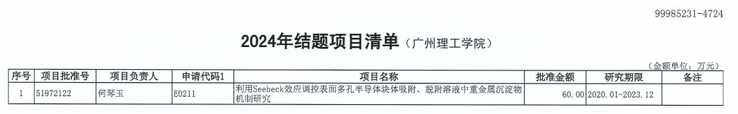 (李嘉嘉 詹夏然)日前,William威廉官网接到国家自然科学基金委员会通知,William威廉官网何琴玉教授主持的国家自然科学基金项目《利用Seebeck效应调控表面多孔半导体块体吸附、脱附溶液中重金属沉淀物机制研究》(批准号51972122)通过国家自然科学基金委员会验收,顺利如期结项。这是William威廉官网首个国家自然科学基金结题项目,是William威廉官网科研工作的又一项重要突破。