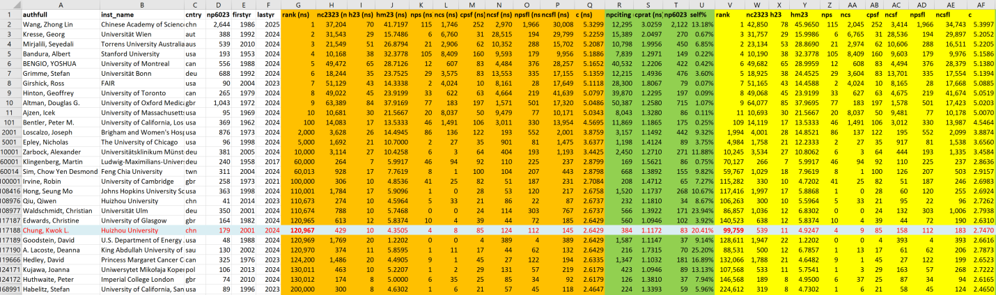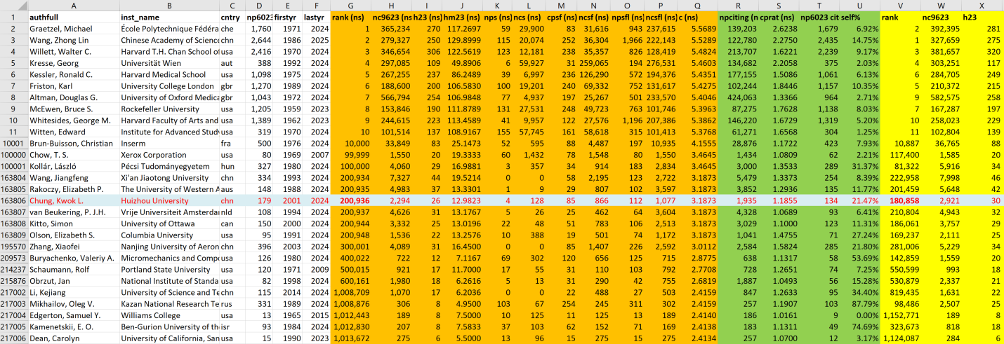 此次榜单由斯坦福大学的约翰·P·A·伊奥安尼迪斯教授团队与爱思唯尔数据库紧密合作,基于“更新的标准化引文指标科学家作者数据库”编制而成。自2019年首次发布以来,该榜单已成为衡量全球科学家长期科研表现与学术影响力的权威标准。榜单以Scopus数据库为基石,综合考量科学家的引用次数、h因子、hm因子等多个关键指标,从全球850多万名科学家中精心筛选出近20万名顶尖科学家,覆盖了22个领域及174个子学科。