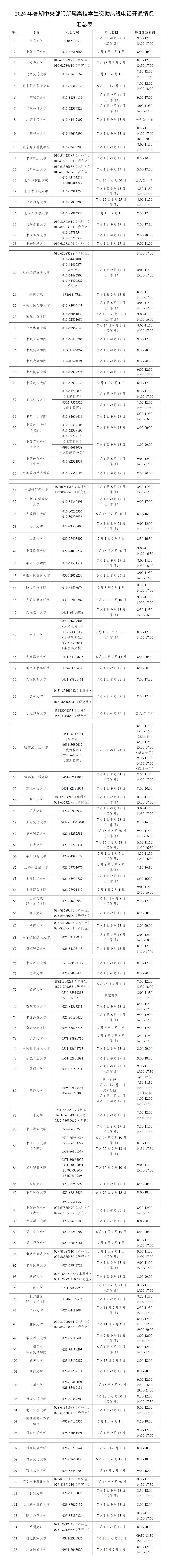 今年暑期,教育部将继续开通高校学生资助热线电话,号码为010—66097980、010—66096590,受理时间为7月1日—9月15日,每天8:00—20:00,为大学新生特别是家庭经济困难的大学新生提供资助政策咨询与帮助。各省(自治区、直辖市)和中央部门所属高校同步开通热线电话,电话号码与开通时间如下。