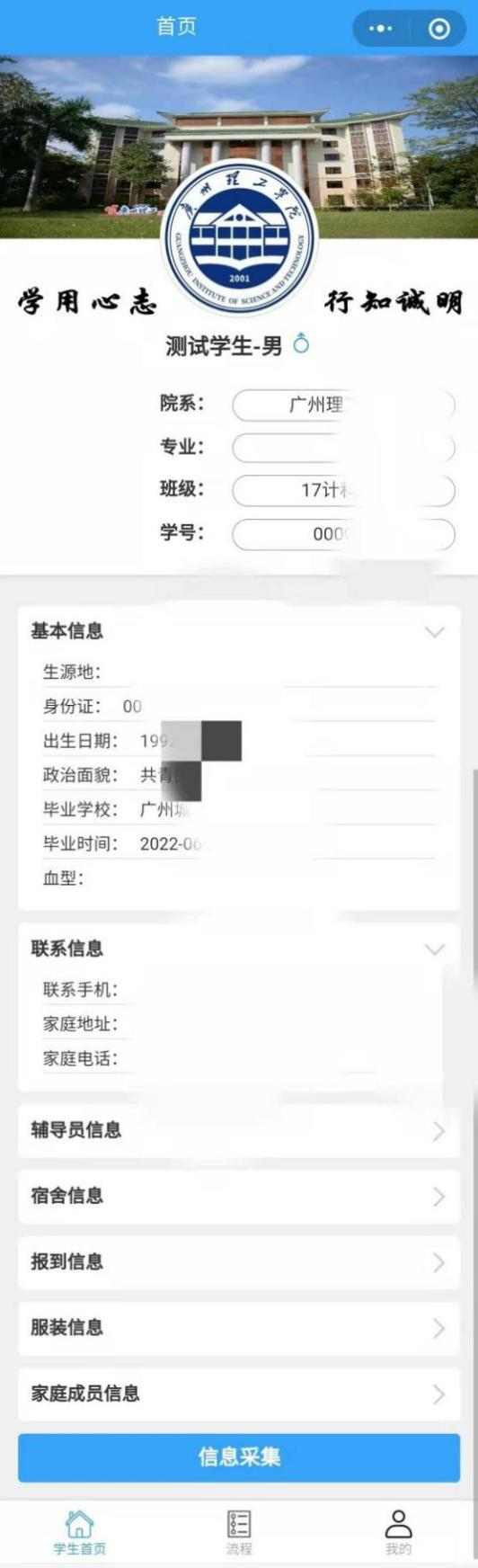 登录成功后,点击底部的“学生首页”菜单,可查看考生个人信息。确认无误后,下滑到页面底部,点击“信息采集”,按照系统提示补全个人信息。(系统会自动更新辅导员、宿舍等信息内容。)