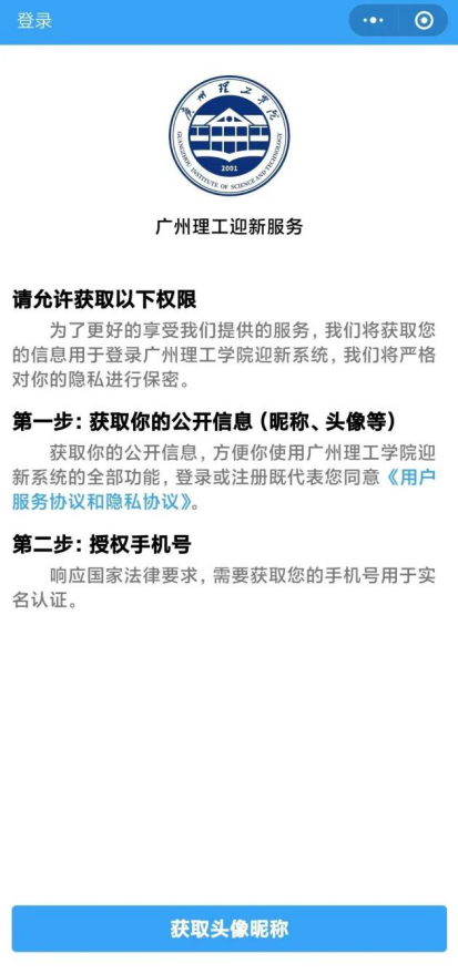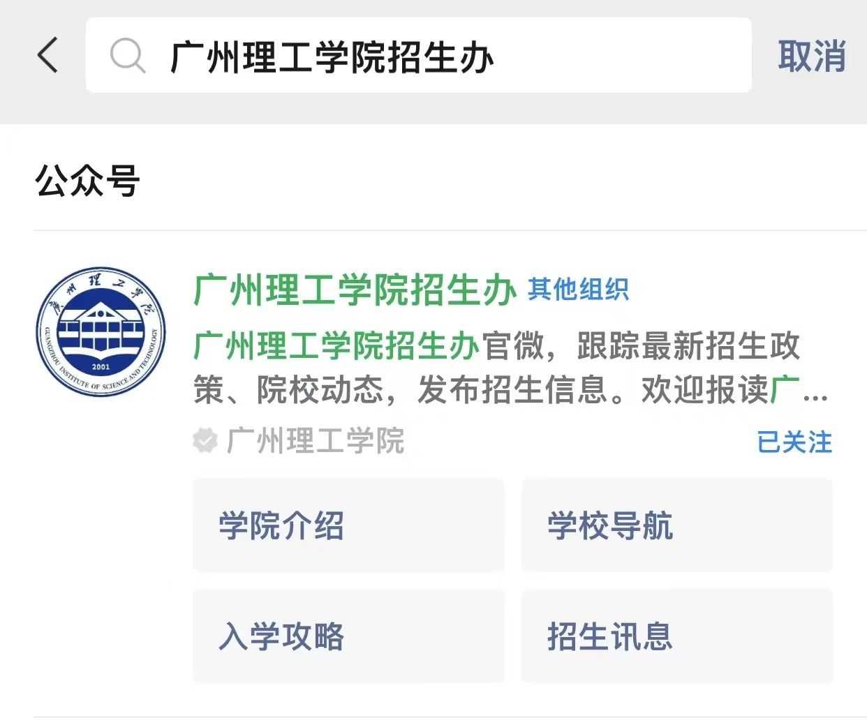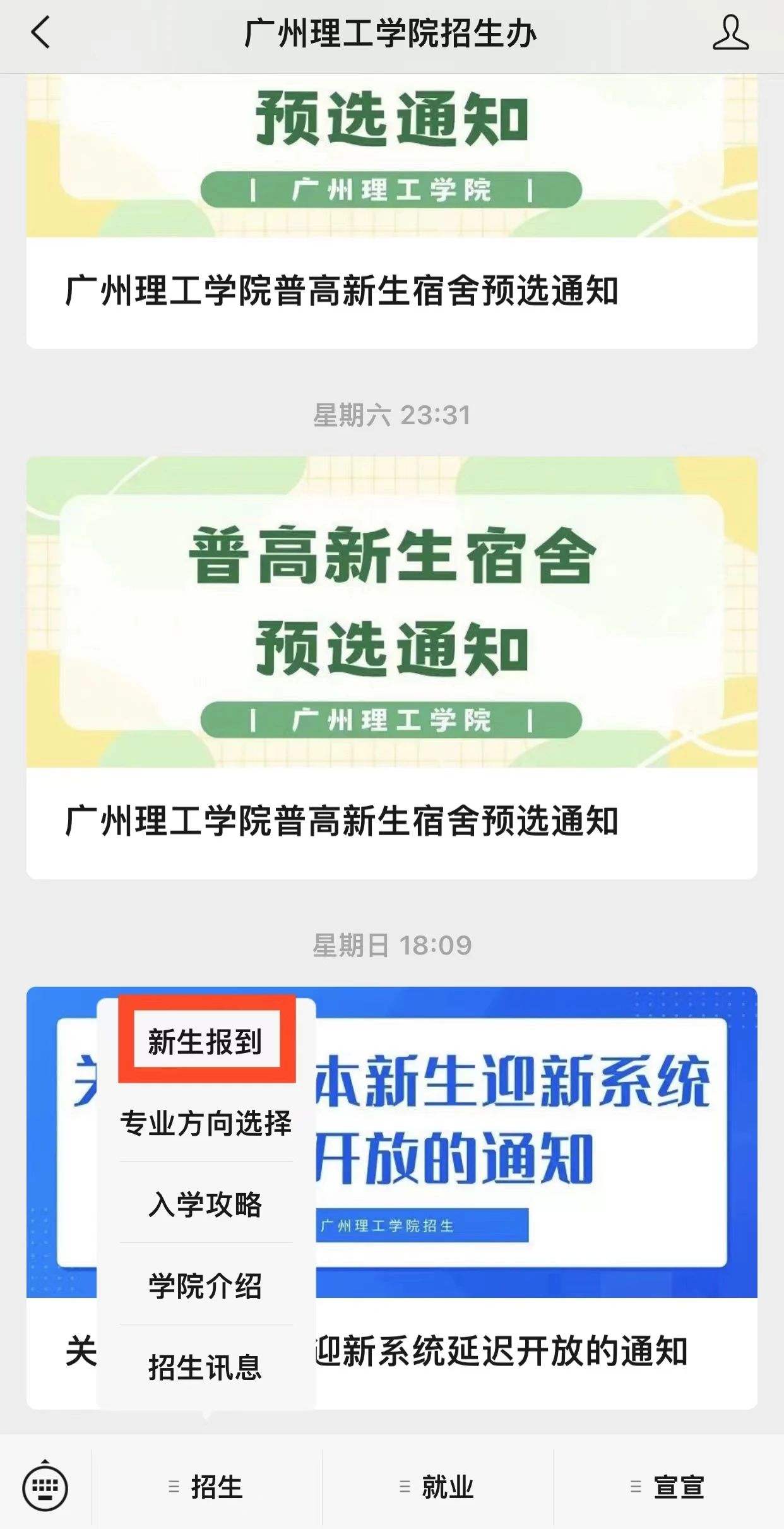 方式二:在微信中搜索并关注:“广州理工学院招生办”公众号。进入公众号,在底部菜单中找到“新生报到”菜单项,点击可跳转迎新系统小程序。
