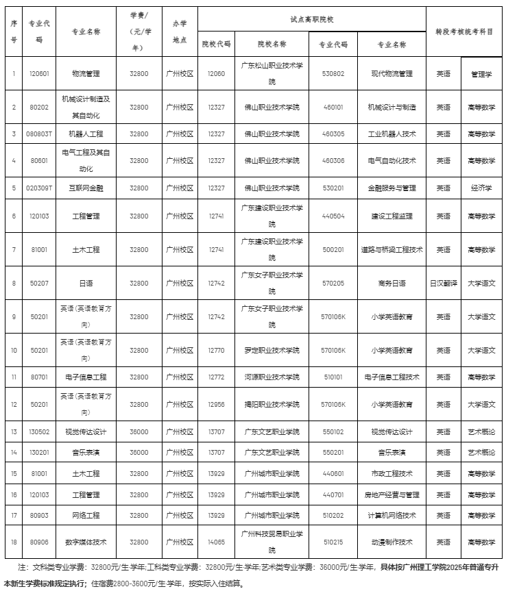 广州理工学院2025年三二分段专升本转段招生专业目录