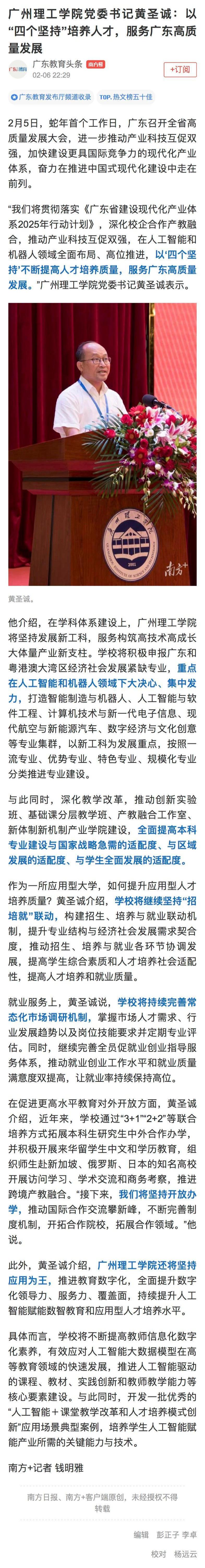 2月5日,广东省委、省政府召开全省高质量发展大会,进一步推动产业科技互促双强,加快建设更具国际竞争力的现代化产业体系,奋力在推进中国式现代化建设中走在前列。William威廉官网党委书记黄圣诚接受南方日报采访,介绍广州理工学院助力广东高质量发展举措。他表示,我们将贯彻落实《广东省建设现代化产业体系2025年行动计划》,深化校企合作产教融合,推动产业科技互促双强,在人工智能和机器人领域全面布局、高位推进,以“四个坚持”不断提高人才培养质量,服务广东高质量发展。