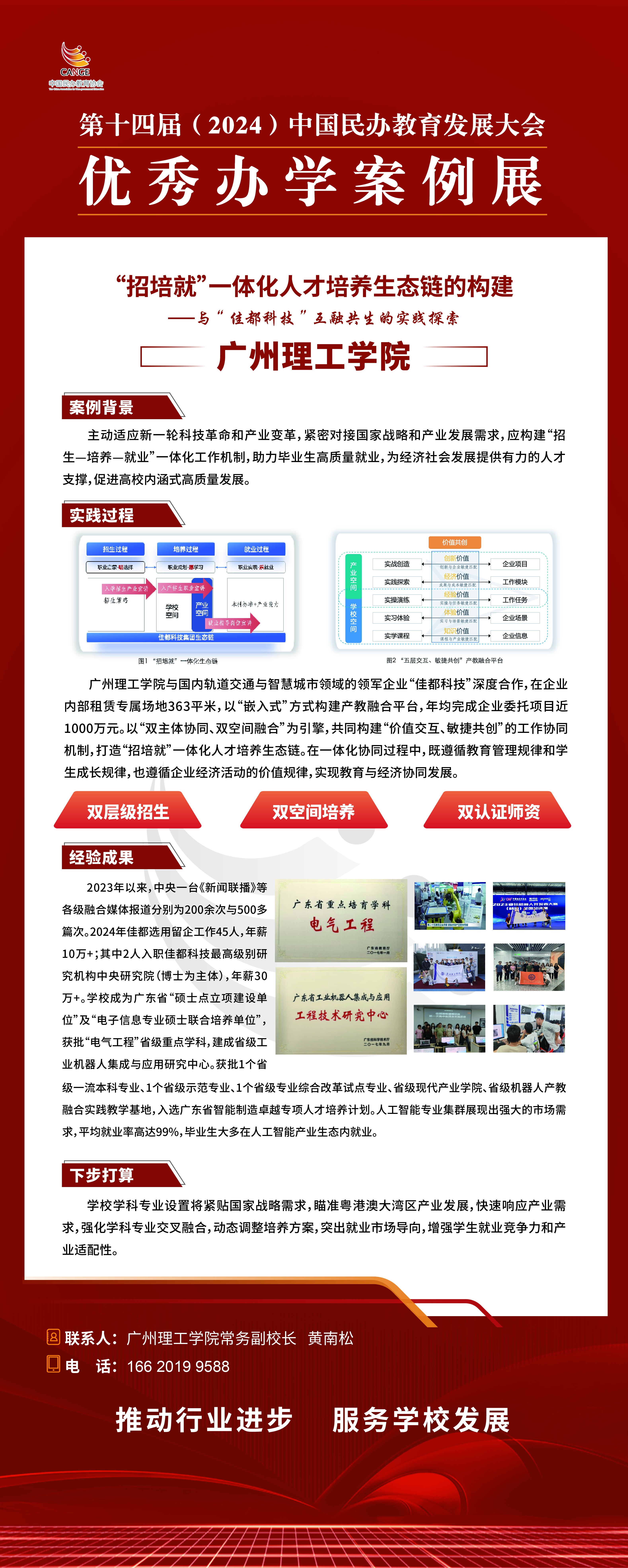 2023年以来,中央一台《新闻联播》等各级融合媒体报道分别为200余次与500多篇次。2024年佳都选用留企工作45人,年薪10万+;其中2人入职佳都科技最高级别研究机构中央研究院(博士为主体),年薪30万+。学校成为广东省“硕士点立项建设单位”及“电子信息专业硕士联合培养单位”,获批“电气工程”省级重点学科,建成省级工业机器人集成与应用研究中心。获批1个省级一流本科专业、1个省级示范专业、1个省级专业综合改革试点专业、省级现代产业学院、省级机器人产教融合实践教学基地,入选广东省智能制造卓越专项人才培养计划。人工智能专业集群展现出强大的市场需求,平均就业率高达99%,毕业生大多在人工智能产业生态内就业。