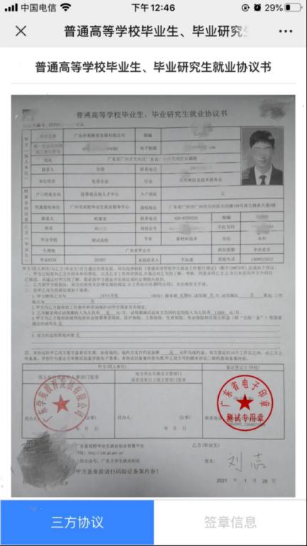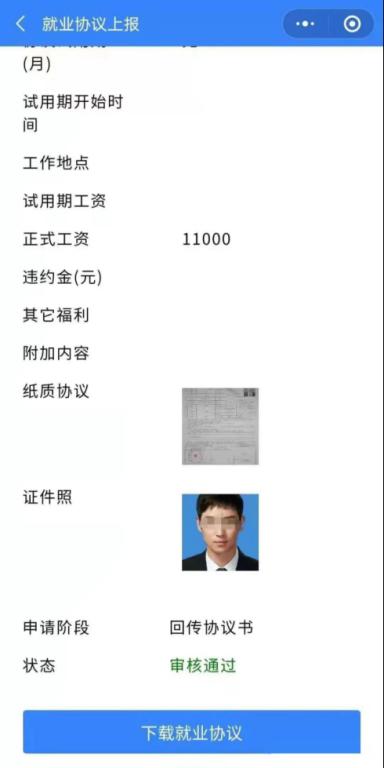 ②审核完成后,学生自行下载电子就业协议书、打印后,拿到用人单位或就业主管部门进行盖章,用手机将已经签字盖章的就业协议书拍照回传到小程序,等待院校进行审核。