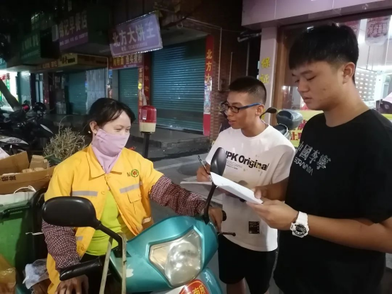 在实践队员收集问卷调查时遇到当地居民李阿姨,她觉得普通话特别好听,但是自己不敢讲,因为觉得自己说的不标准、有口音。我们的队员立马鼓励李阿姨,一个一个字地教李阿姨说常用的词语,在队员们的悉心指导下,李阿姨用普通话与队员们友爱地喊起了口号。