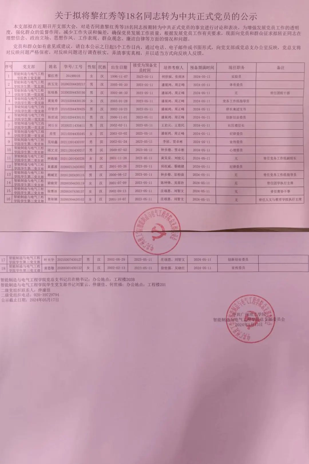 本支部拟在近期召开支部大会,对是否同意黎红秀等18名同志按期转为中共正式党员的事宜进行讨论和表决,为增强发展党员工作的透明度,强化群众的监督作用,减少工作失误和偏差,确保党员发展工作质量,根据发展党员工作有关要求,现面向党员和群众征求拟转正同志在理想信念、政治立场、思想作风、工作表现、群众观念、廉洁自律等方面的情况和问题。