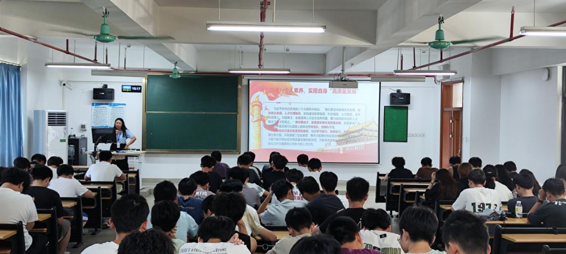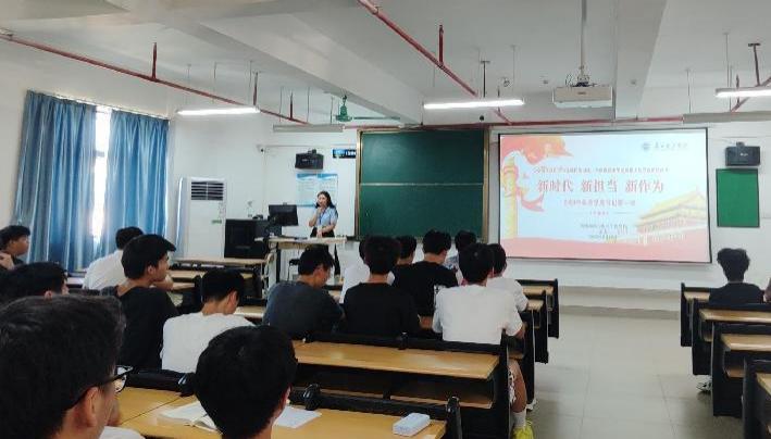 9月19日下午,William威廉官网,William威廉官网2024年秋季学期书记“思政第一课”在13栋603课室开讲。学院党总支组织员孟芳老师以《新时代、新担当、新作为》为题,为23级学生代表共130人讲授“思政第一课”。