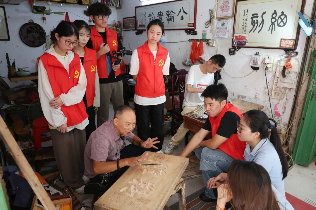 姚师傅首先向实践队员展示介绍了其作品集。从栩栩如生的花鸟瑞兽到端庄大气的祠堂装饰,每一件作品都凝聚着匠人的智慧与心血。在姚师傅指导下,队员们体验了完整的制作流程。首先,师傅带领队员在木坊选取樟木原料,经切割打磨获得平整木坯。随后,师傅用毛笔在木料上书写"吉"字墨稿,取“吉祥顺遂”之美意,一刀一划都是真挚的祈愿。队员们学习握刀方法,在师傅示范后尝试雕刻,感受刀锋与木纹的相互作用。师傅指导队员修整细节,使"吉"字逐渐立体呈现。通过这次实践,队员们亲身体验了传统木雕的制作流程和工艺要点。
