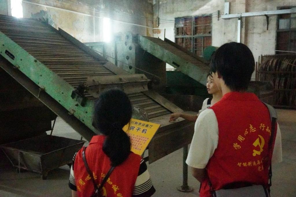 清晨,“锦带花”突击队分成两路,两名队员留在田江村村委给孩子们上课,其余七名队员前往上茗轩和英九庄园开展茶文化调研。在上茗轩的负责人详细讲解了茶文化的历史与传承,特别强调了青年一代在茶文化传播中的重要作用。队员们一边品鉴清香的红茶,一边聆听茶道精髓,还参观了珍贵的制茶老机器,感受传统工艺的魅力。