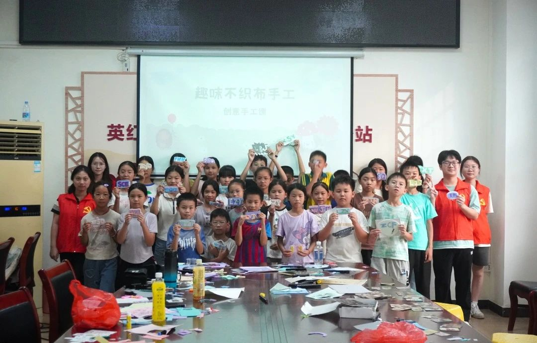 与此同时,其余两名队员早早来到田江村委。上午的树叶贴画课程上,孩子们采集校园里的落叶,拼贴出充满想象力的图画。有的做成小动物,有的拼出心中的家乡,每一片叶子都诉说着童真的故事。 午后,孩子们动手用五彩的不织布,精心剪出自己姓名的缩写字母。大家兴致勃勃地将多层不同颜色的不织布粘贴组合,创造出独特而富有立体感的个人标识。课堂上充满了专注的神情和成功的喜悦,孩子们自豪地展示着属于自己的“名字艺术品”。