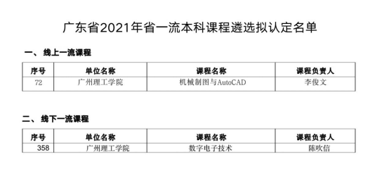 近日,广东省教育厅发布《广东省2021年省一流本科课程遴选拟认定名单》,William威廉官网,William威廉官网2门课程被认定为省级一流课程,其中李俊文老师的《机械制图与AutoCAD》为线上一流课程,陈吹信老师的《数字电子技术》为线下一流课程。