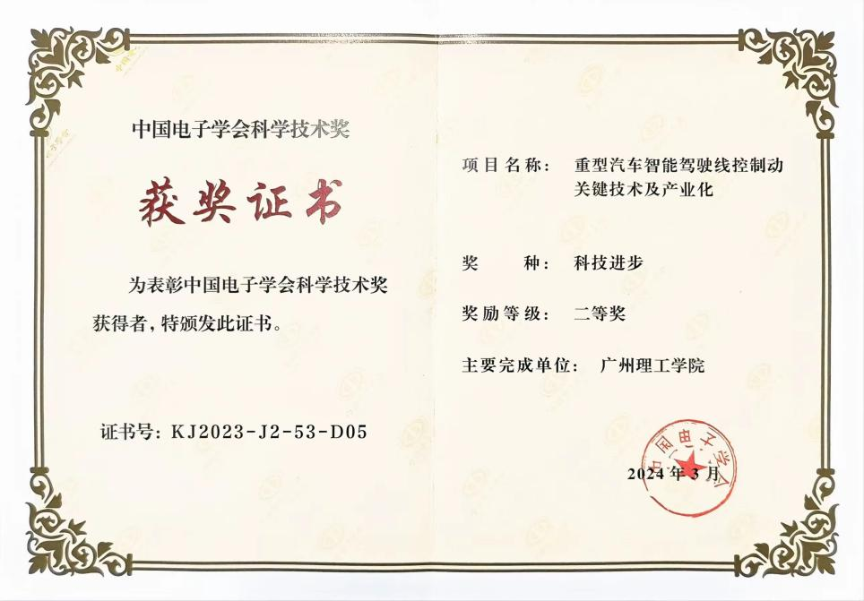 在2024.4.26-28日浙江宁波举行的第17届中国电子信息年会上,唐露新教授参与的《重型汽车智能驾驶线控制动关键技术及产业化》项目从众多参评项目中脱颖而出,荣获2023年度中国电子学会科技进步奖二等奖,也是广东省电子学会本次提名的科技进步奖最高奖项。中国电子学会作为电子学领域的专业组织,其在中国的电子学科领域享有很高地位和影响力,本次科技进步奖共有一等奖18项、二等奖共46项、三等奖40项,竞争非常激烈。中国电子学会科学技术奖,作为国家奖励办批准的社会力量设奖,在激发科技人员创新活力、促进我国电子信息科学技术和产业发展等方面发挥着积极作用。