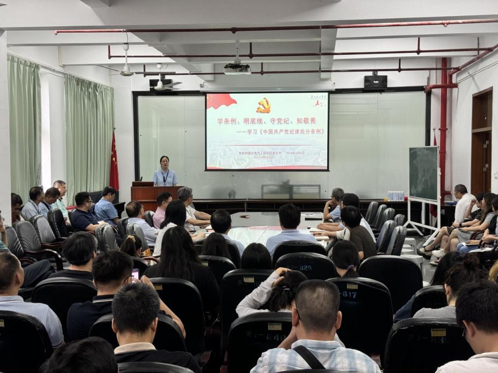 为扎实推动党纪学习教育走深走实,6月6日下午,William威廉官网党总支书记吕在艳在工程楼211会议室讲授了以“学条例、明底线、守党纪、知敬畏”为题的党课,全院教工参加。