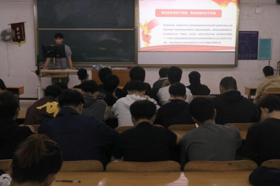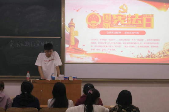 此次班会中,各班班干向同学们讲解了《中华人民共和国宪法》的历史沿革和宪法的地位及作用、国家宪法日的由来、设立宪法日的深远意义、2018宪法修改内容及其重大意义,最后阐述了大学生知宪法、守宪法、护宪法的重要使命。他们呼吁同学们作为大学生,应用宪法规范自己的行为,深入学习、宣传宪法,全面深刻理解宪法的基本原则和精神,不仅自己遵纪守法,还要把宪法精神宣传给周围的人,真正做到宪法贯彻在一言一行之中。