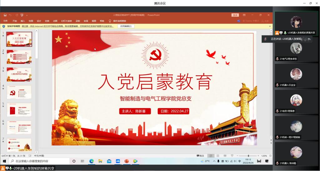 4月26日晚,为加强全院学生对中国共产党的认识,提高思想觉悟,端正入党动机,积极向党组织靠拢,根据学校三全素质活动周的工作要求和学院党总支的党建引领安排,William威廉官网党总支通过线上腾讯会议的形式,对全院所有在校学生进行入党基本知识培训。五场线上会议分别由学生党支部支委潘展鸿、苏国辉、黄炅杲、苏国辉、张智昭主持。