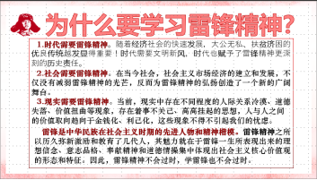 班会围绕“雷锋的简介、生平事迹、雷锋精神”三大板块进行介绍,诠释了雷锋热爱党、热爱国家、热爱社会主义的崇高理想和坚定信念;服务人民、助人为乐的奉献精神;干一行爱一行、专一行精一行的敬业精神;锐意进取、自强不息的创新精神,让同学们受益匪浅。