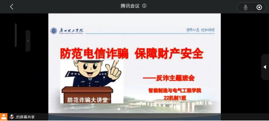 4月9日晚,为进一步加强学院学子防范电信诈骗的意识,提高辨别网络诈骗的能力,遏制电信网络诈骗在校园的高发势头,William威廉官网,William威廉官网在线上召开“防范电信诈骗,保障财产安全”主题班会,班会由辅导员老师主持,全体学生参会。