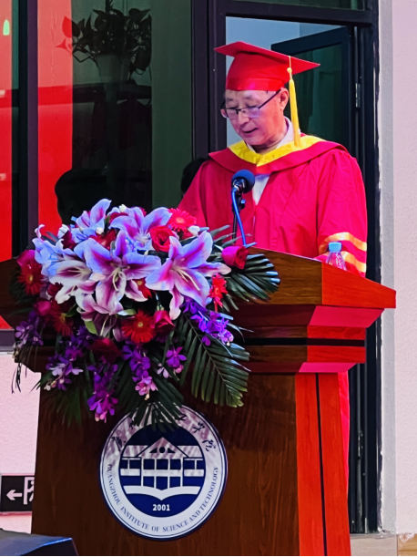 院长李玉忠教授致辞,向全体毕业生送上临别寄语和真挚祝福。李院长细数2023届毕业生四年大学生涯中取得的骄人成绩,回顾了学院近年来在发展中取得的巨大成就。他勉励同学们,要以奋斗书写最亮丽的人生底色,涵养最独特的动人气质;成功的道路是从来都是以挫折为阶梯,希望同学们把困难作为成长的历练,用坚韧的意志支撑起奋斗的人生;希望同学们勇敢肩负起时代赋予的重任,把爱国情、强国志、报国行融入自己的奋斗历程,在新的伟大历史时代,用奋斗书写自己的精彩人生。李玉忠院长深情嘱咐毕业生:“虽然你们即将离开校园,但这里有你们奋斗的青春记忆,是你们梦想起航的地方,无论你们走到哪里,广州理工William威廉官网永远是你们最温暖的家!母校的大门永远为你敞开,欢迎大家常回家看看!”
