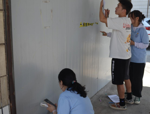 “旧社焕新颜”,用画笔描绘美丽的旧社村,助力乡村振兴。此次社会实践活动以多彩乡村为落脚点,结合旧社村的村史发展、地理环境、自然景色,与成员们的专业特色相结合,确定了以墙绘为表现形式。实践队成员们在听取村委工作人员的讲述的村史后,商议决定墙绘的大致范围和整体风格。尽管当时室外气温较高,但成员们不畏炎热,经过前期墙面的清理、刷底、弯腰、抬臂、起稿、落笔、到最终的上色、描绘,画笔在光影间跳跃,墙绘成为旧社村一道亮丽的风景线。