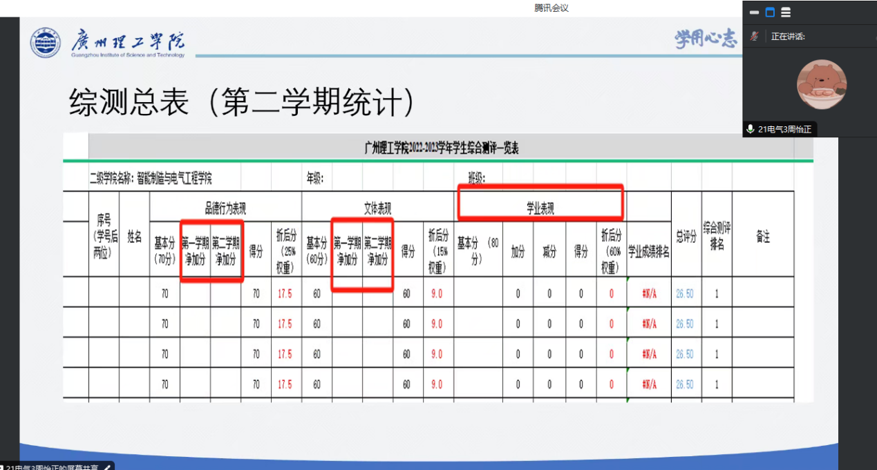 谢燕惠老师从综测的定义、综测的构成等方面出发,强调了综合测评结果在评优评先、推优入党等方面的重要作用,鼓励各班在综测计算工作中相互交流、积极沟通,要求各班委充分理解并向班级同学准确传达本次会议的相关内容,本着认真负责的态度和公平、公正、公开的原则开展综测计算工作。此外,周怡正同学在此基础上,为同学们详细介绍了综测计算的相关细则和注意事项,就综测计算板块中的奖惩加分模块进行了详细解读,展示相关证明材料收集过程,为大家提供相关统计辅助资料。会议尾声,23级班委积极互动,王思民同学针对参会同学的疑惑进行一一解答,使得各班委对于此次学生综合素质测评工作有了更加清晰的认识。