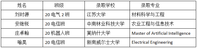在今年的研究生录取中,William威廉官网刘时源、安继锐、庄卓翰、喻昊4名同学顺利通过考试,分别被江苏大学,中南林业科技大学,莫纳什大学,新南威尔士大学录取。