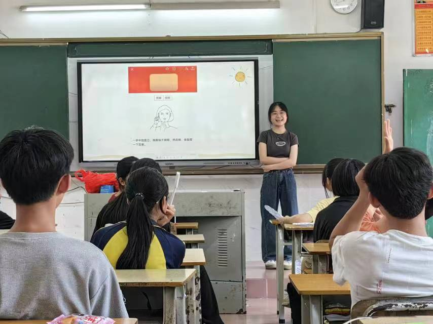 在手语课上,通过猜手语小游戏的导入来调动小朋友们的兴趣,使课堂的氛围活跃起来。在对手语进行简单介绍后,张钰翎同学开始教授基础手语词汇。为了确保每位小朋友都能准确理解,张同学的每一个手势都做得标准而有力,每一句话话语都表达得清晰明朗,小朋友们则全神贯注地盯着张同学的双手,生怕错过任何一个细节。