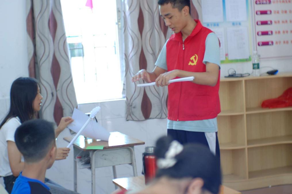 在手工课上,权群益同学和李恒乐同学进行分工合作,权同学负责给每个孩子准备了三张白纸和双面胶,紧接着向小朋友们介绍手工扇子的制作材料及制作步骤,然后向小朋友们演示了一遍制作过程。在演示过程中,李同学认真观察小朋友们的制作步骤,并及时为小朋友们提供指导和帮助,最后在两位同学的辅助下,小朋友们完成了手工扇子的制作。小朋友们在此过程中培养了新的的兴趣爱好,也大大提升了自己的实际动手能力。