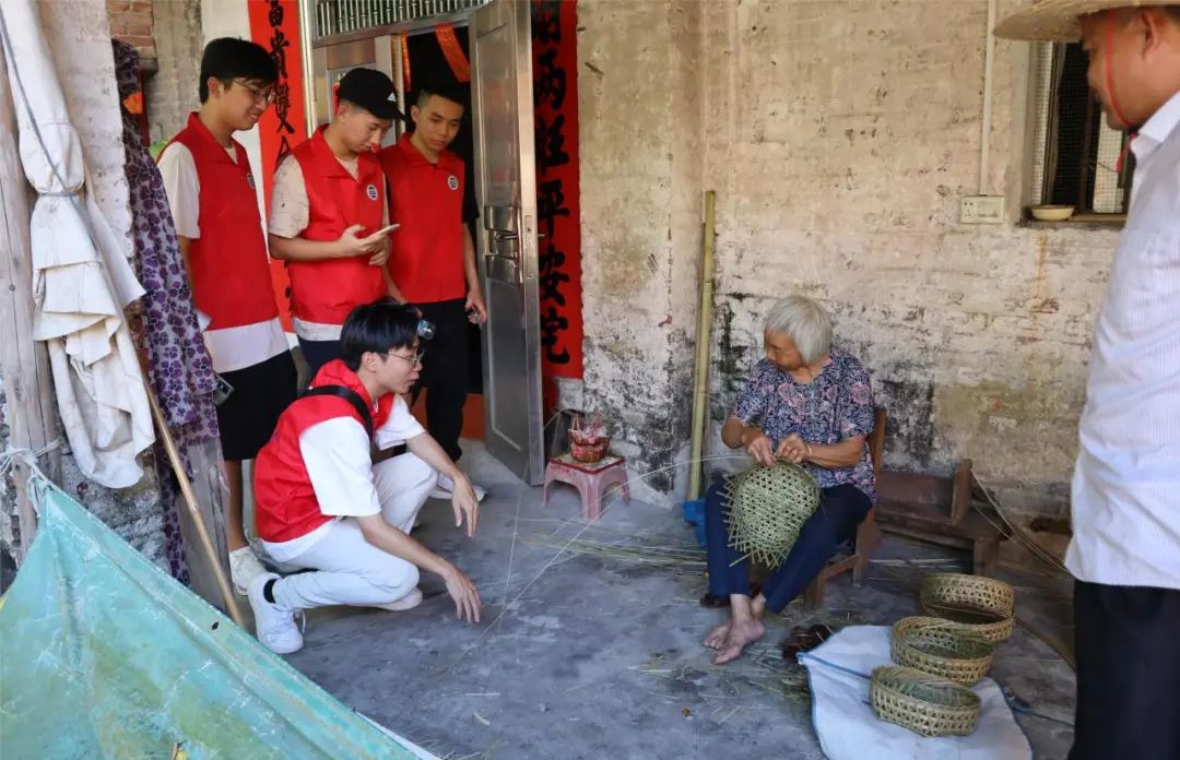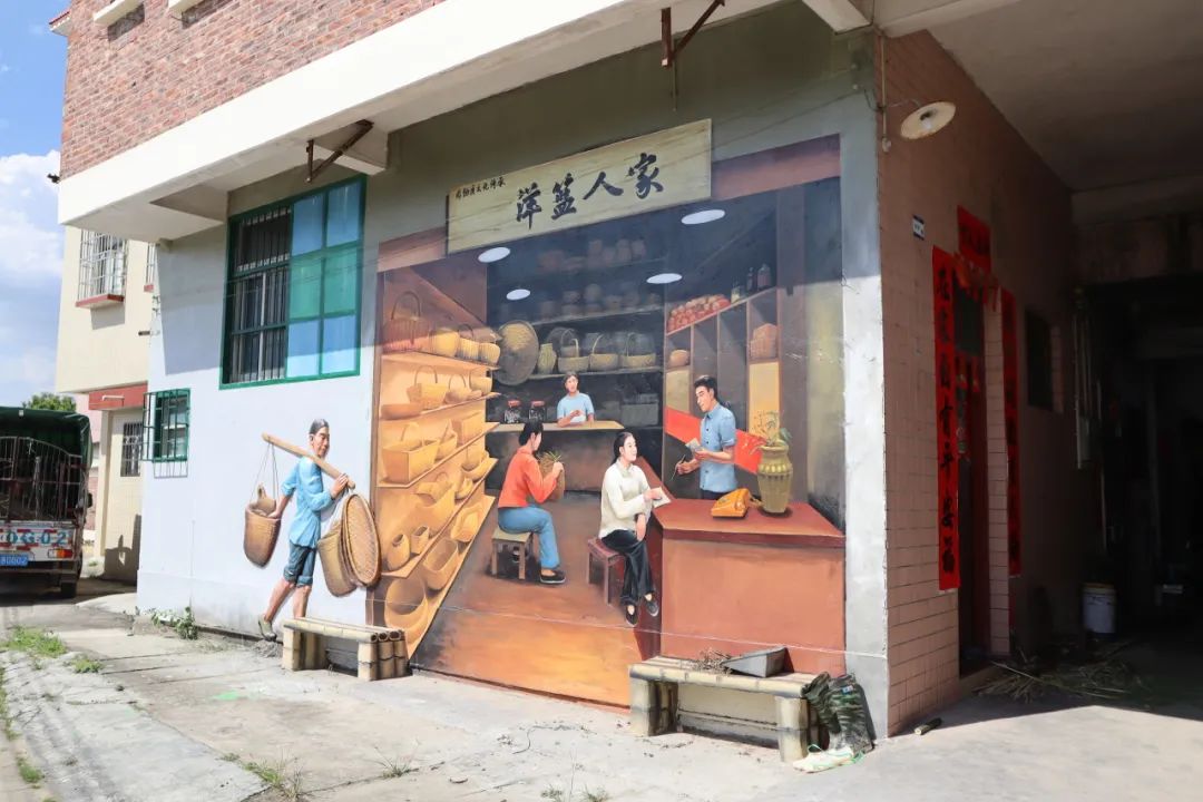 走进长湖村,映入眼帘的是成片的竹林,家家户户门前堆放着竹篾,在这里,整个村子都带着浓厚的洋篮文化的气息,这里有许许多多的艺术文化墙,感受到了村民对洋篮文化的热爱和薪火相传的活力。在陈站长的带领下,我们来到了当地有名的洋篮编织手艺人的家里走访,通过交谈,我们了解了洋篮制作方面的细节,热情的老奶奶们还邀请我们一起编织洋篮。
