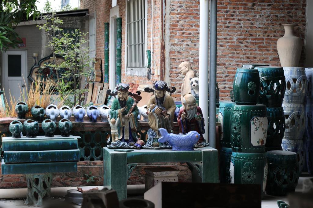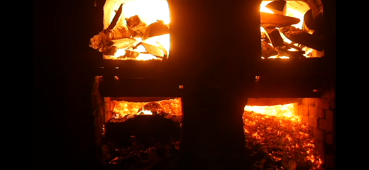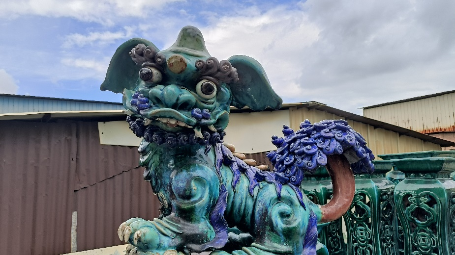 10、烧窑区,这里是整个陶塑制作过程的关键环节。师傅们会在窑壁上的五星口不断注入细长的松木,从最底层的五星口逐渐加到最高层,一层一层往上。在短短两三个小时内,窑内的温度就能迅速升高到 1250°C。在这个过程中,由于泥土中富含各种矿物质,在高温下会发生复杂的化学反应。不同的温度区间,会让陶塑瓦脊呈现出不同的颜色与渐变色,真正实现了“入窑一色,出窑万彩”的奇妙变化,让每一件陶塑瓦脊都成为独一无二的艺术珍品。