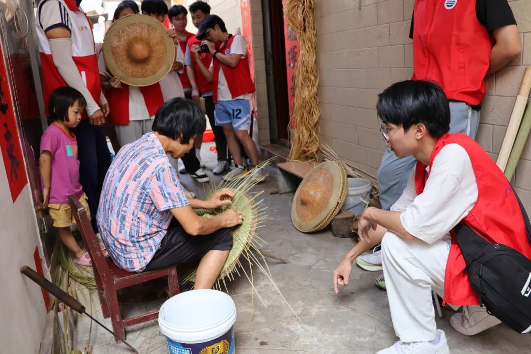 告别了编织洋篮的阿嬷们,队员们进入村巷中继续寻找手艺人。这时一顶油亮亮的斗笠吸引了大家的注意。在巷子中,有阿嬷阿公在制作斗笠,阿嬷负责斗笠主体的编织,阿公负责斗笠帽檐的编织。据正在编织斗笠表层的阿嬷介绍,这种斗笠同样工序繁杂,而且使用的材料更多样化,由粽叶,油纸布,篾片等材料制作而成。当编织完斗笠主体后,阿公便将用竹条弯成的帽檐编织到斗笠上,使得斗笠更加坚固耐用。最后,还要在斗笠顶上刷一层桐油,增加斗笠的防水性,这样一顶斗笠才算做好了。