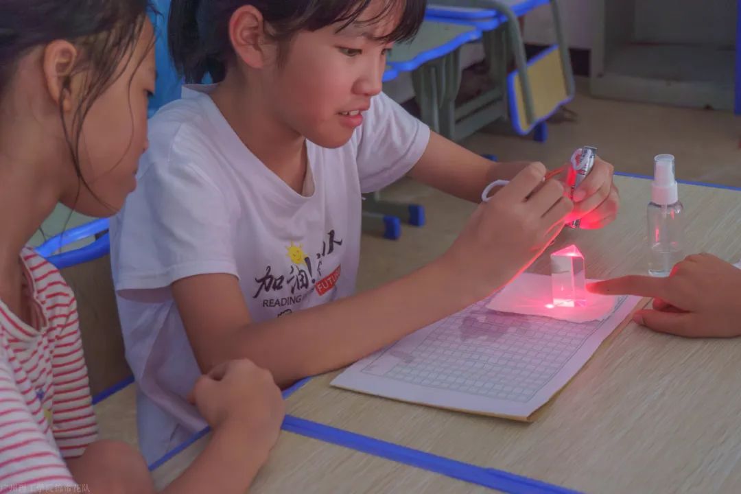 7月13日,“锦带花”突击队在云岭小学的志愿支教之旅已经进入了第三天。队员们认真备课,设计了一系列既有趣又富有教育意义的物理理论和实践操作的课程,比如“光的折射光路图理论讲解课”、“三棱镜散射探索课”、“奇妙色彩融合课”、“超轻粘土海底小动物制作课”等。