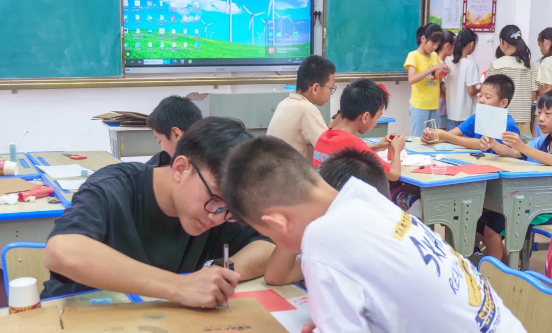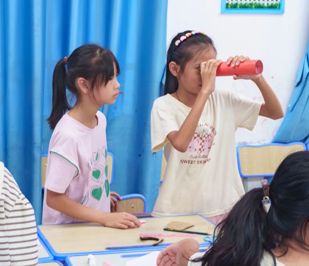 上午的课程安排丰富多彩,包括了望远镜原理与制作、英语教学以及粘土手工制作。在望远镜原理与制作的课堂上,队长杨权睿用通俗易懂的方式向孩子们介绍了伽利略式望远镜的工作原理,并与队员一同带领他们动手制作属于自己的望远镜。