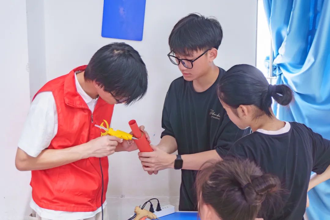 队长和队员使用热熔胶帮助学生粘连镜片
