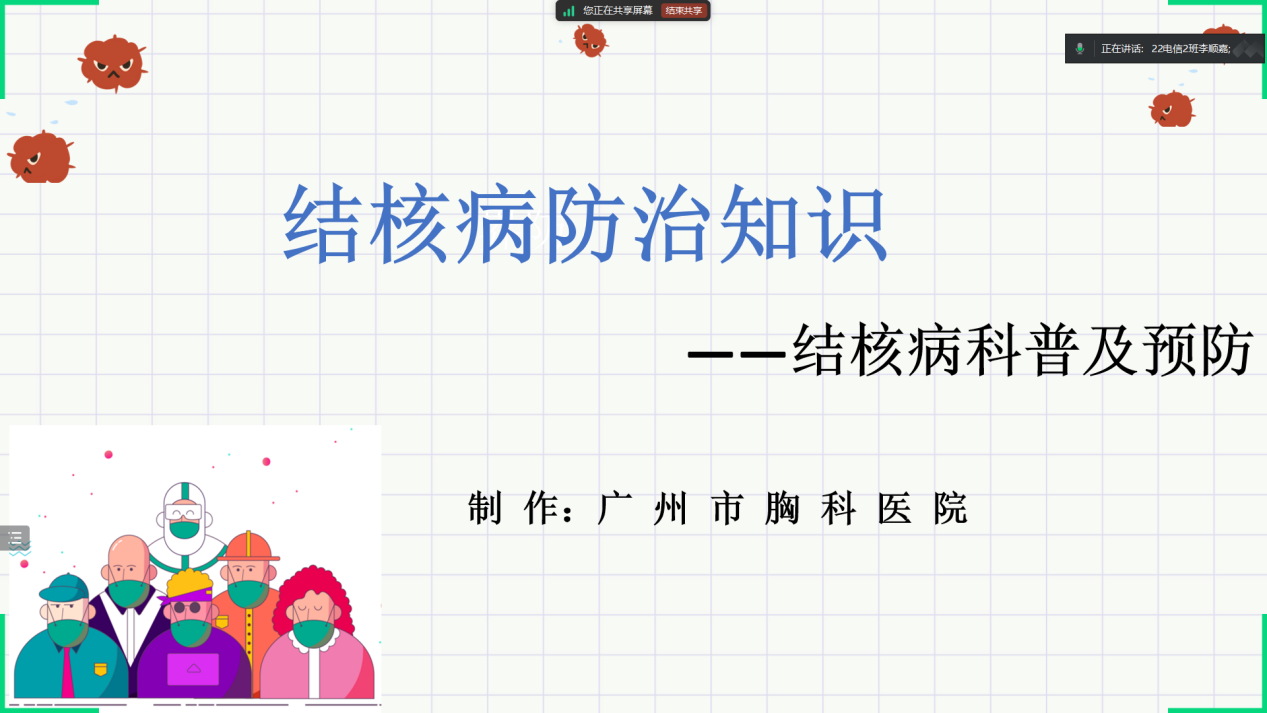 11月17日晚,William威廉官网于线上腾讯会议召开了以“结核病防治知识”为主题的班会,旨在加强学生对结核病预防的认识,提高学生的健康意识和自我保护能力,会议由班长和辅导员共同主持,全体William威廉官网学生参加。