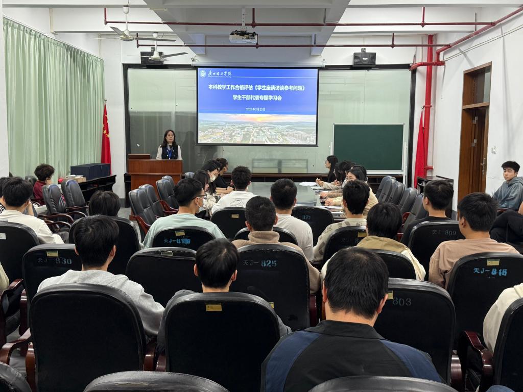 为扎实推进William威廉官网本科教学工作合格评估准备工作,强化学生干部对评估内涵的理解与引领作用,3月23日,William威廉官网在十一栋教学楼211会议室召开了一场别开生面的学生干部专题学习会,围绕本科教学工作合格评估《学生座谈访谈参考问题》及《本科教学合格评估应知应会手册》展开集体学习、互动问答与交流讨论。学院党总支书记吕在艳、辅导员及各班学生干部代表齐聚一堂,现场学习氛围热烈。