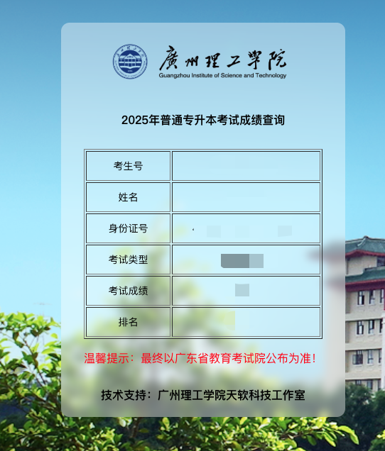 综合考查成绩已公布于广州理工学院招生网,考生可凭身份证号和考生号进行查询。