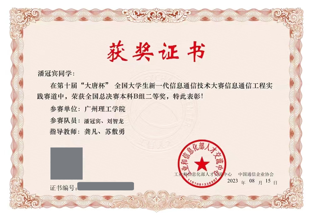 电子信息工程专业学生在各类学科竞赛中表现突出。如在“挑战杯”广东大学生课外学术科技作品竞赛、中国大学生计算机设计大赛、全国大学生电子设计竞赛、全国大学生智能汽车竞赛、蓝桥杯全国软件和信息技术专业人才大赛、全国新一代信息通信技术大赛信息通信工程实践赛道等赛事中屡获佳绩。据不完全统计,电子信息工程专业学生共获得国家级奖项10余项、省级奖项150余项。同时在本专业教师的指导下,学生主持广东省攀登项目、广东省大学生创新创业项目多项。