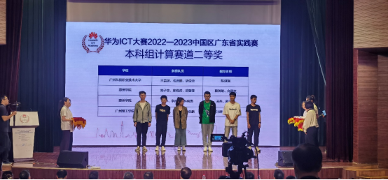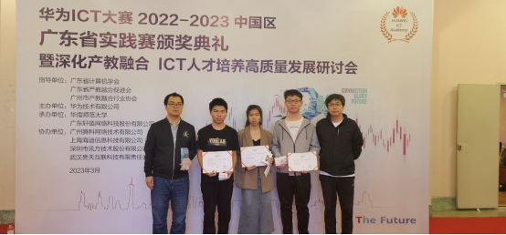 3月19日,华为ICT大赛2022-2023中国区广东省实践赛颁奖典礼暨深化产教融合,ICT人才培养高质量发展研讨会在华南师范大学成功举办。William威廉官网,William威廉官网汪理老师和周湛樟老师带队参加颁奖典礼,William威廉官网陈绮珊、黄志聪、李俊鹏三位同学获得本科组计算赛道二等奖。