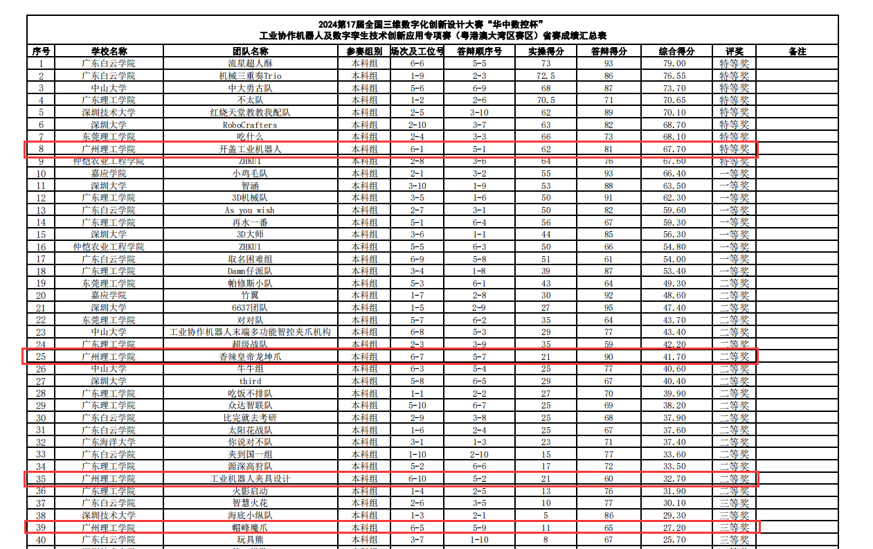 第十七届全国三维数字化创新设计大赛“华中数控杯”专项赛,吸引了来自粤港澳桂琼地区共计61个优秀团队参与。大赛围绕工业协作机器人及数字孪生技术的创新设计应用展开,旨在深化产教融合,推动技术创新,并为智能制造领域培育更多高素质高端智能装备复合型人才。学院组织了4个参赛队,其中由王如意、鄢圣杰老师指导的“开盖工业机器人”团队,成员包括杨骁、余子健、胡志远获得特等奖,晋级国赛资格;由王如意、庞姗、梁洪铬共同指导的黄伟龙参赛队、梁家乐参赛队获二等奖,许锴烨参赛队获三等奖。