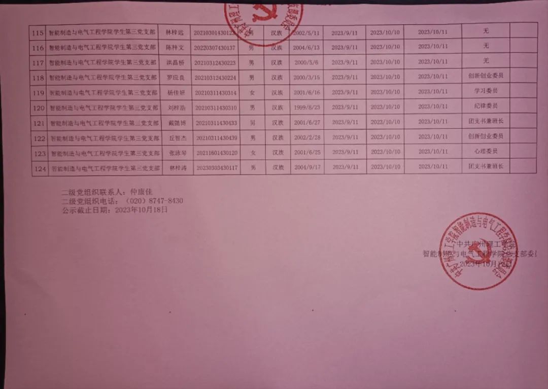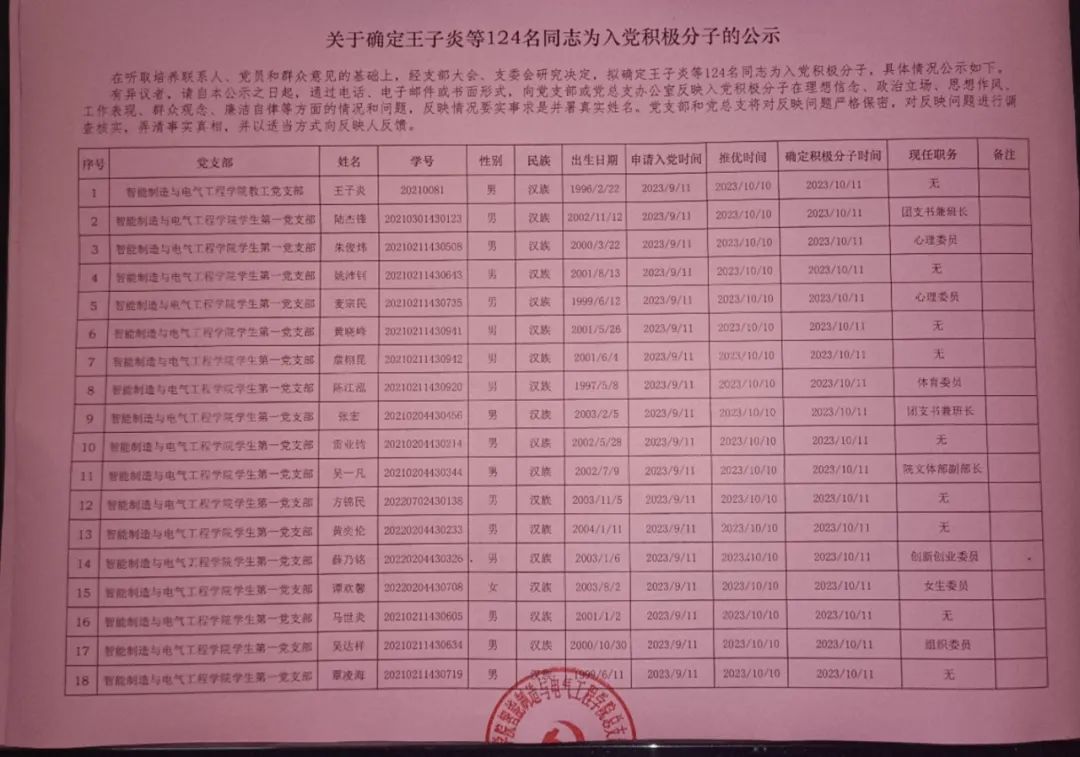 在听取培养联系人、党员和群众意见的基础上,经支部大会、支委会研究决定,拟确定王子炎等124名同志为入党积极分子,具体情况公示如下。如有异议者,请自本公示之日起,通过电话、电子邮件或书面形式,向党支部或党总支办公室反映入党积极分子在理想信念、政治立场、思想作风、工作表现、群众观念、廉洁自律等方面的情况和问题,反映情况要实事求是并署真实姓名。党支部和党总支将对反映问题严格保密,对反映问题进行调查核实,弄清事实真相,并以适当方式向反映人反馈。