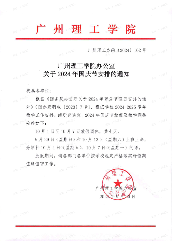 广州理工学院办公室关于2024年国庆节安排的通知