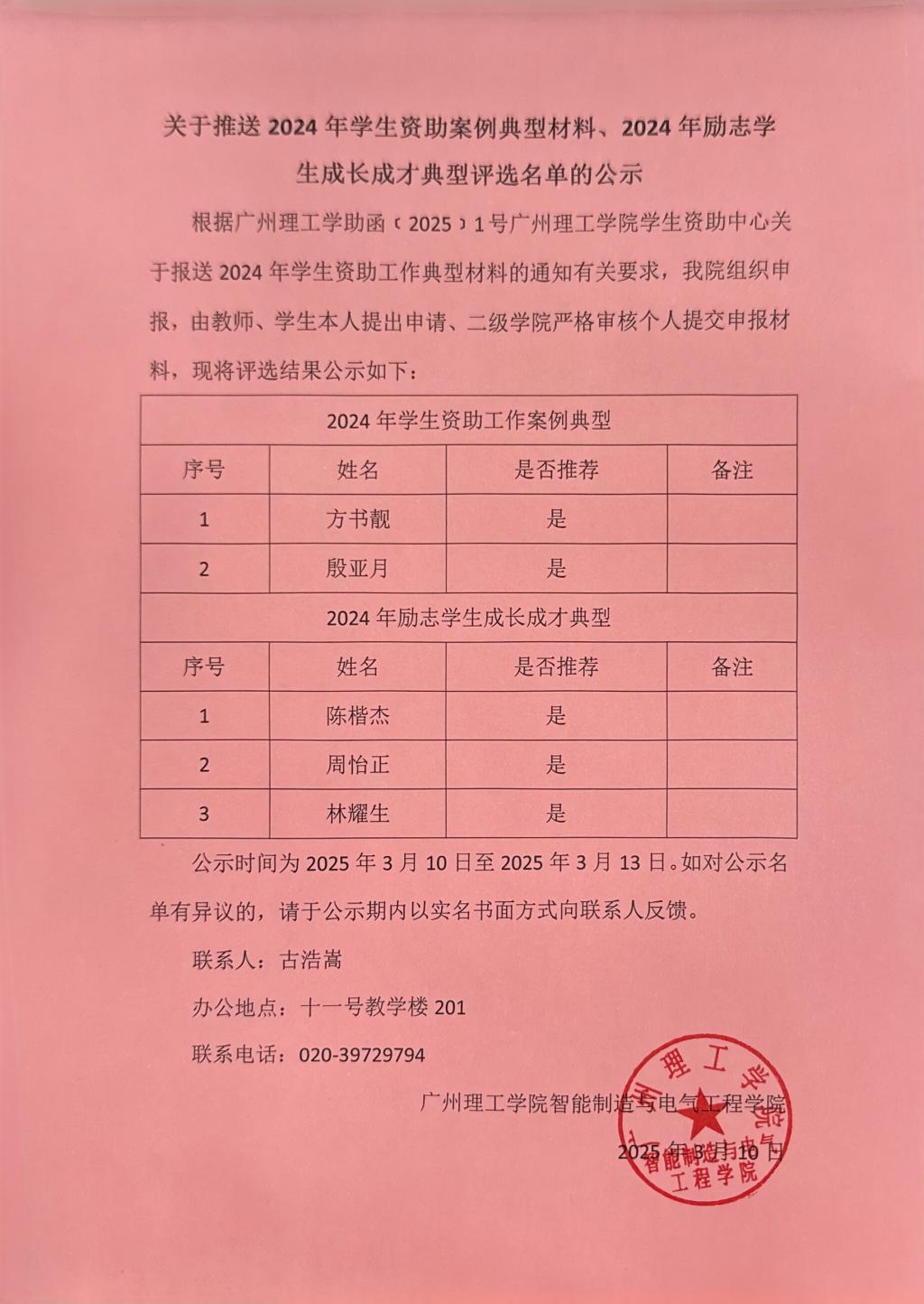 根据广州理工学助函﹝2025﹞1号广州理工学院学生资助中心关于报送2024年学生资助工作典型材料的通知有关要求,William威廉官网组织申报,由教师、学生本人提出申请、二级学院严格审核个人提交申报材料,现将评选结果公示如下: