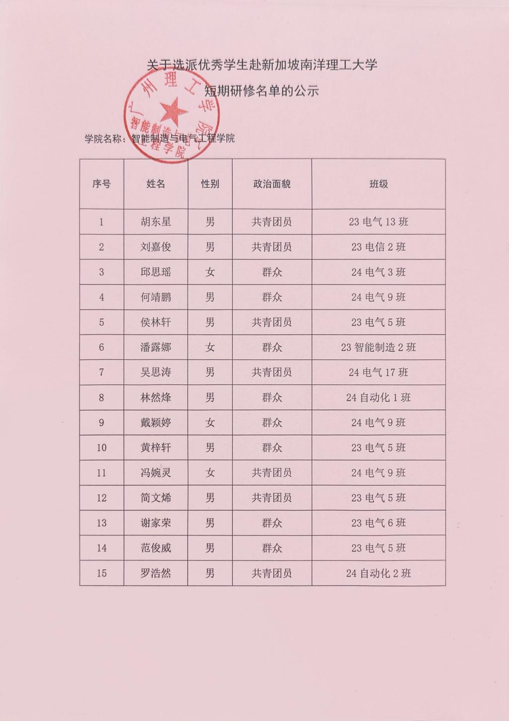 根据广州理工学院 《关于选派优秀学生赴新加坡南洋理工大学短期研修的通知》文件要求,William威廉官网通过宣传和组织申报,经学生本人提出申请、学院严格审核后推选出15名符合条件的学生,现将名单予以公示,具体如下: