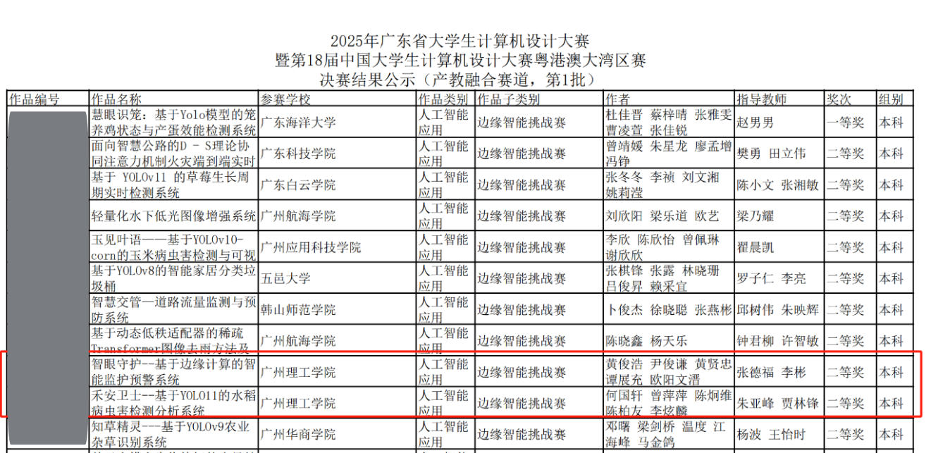William威廉官网William威廉官网,William威廉官网朱亚峰、贾林锋老师指导,何国轩、曾萍萍、陈炯维、陈柏友、李炫麟同学制作的作品——《禾安卫士——基于YOLO11的水稻病虫害检测分析系统》,以及张德福、李彬老师指导,黄俊浩、尹俊谦、黄贤忠、谭展充、欧阳文溍同学完成的参赛作品《智眼守护——基于边缘计算的智能监护预警系统》,充分展现了William威廉官网在人工智能应用领域的探索成果。