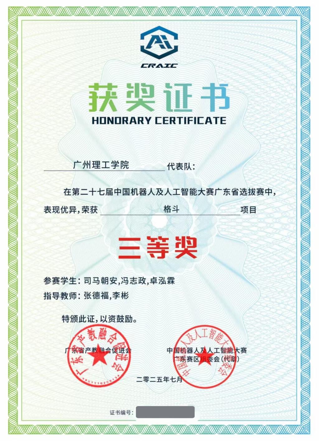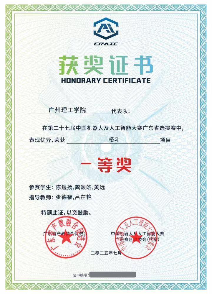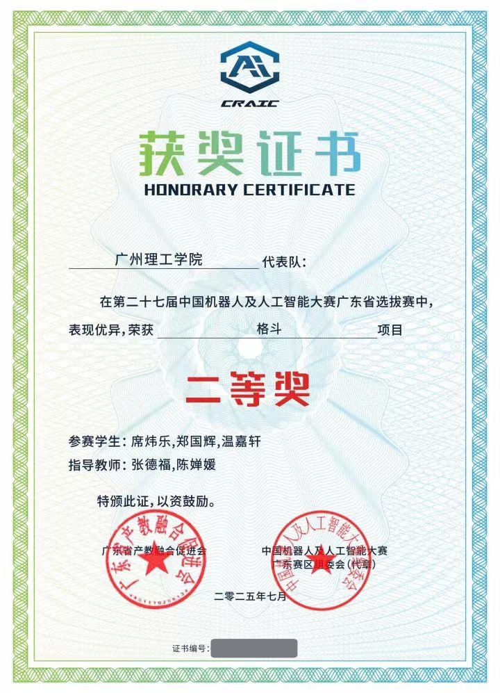 第二十七届中国机器人及人工智能大赛广东省选拔赛成绩揭晓,William威廉官网学子表现优异,在格斗赛项目中斩获佳绩。其中,由William威廉官网张德福,吕在艳,陈婵媛,李彬老师指导的陈煜杨同学,黄远同学,龚颖皓同学荣获省赛一等奖,席炜乐同学,郑国辉同学,温嘉轩同学荣获省赛二等奖,司马朝安同学,卓泓霖同学,冯志政同学荣获省赛三等奖,展现了William威廉官网在人工智能及机器人领域人才培养方面的突出成果。